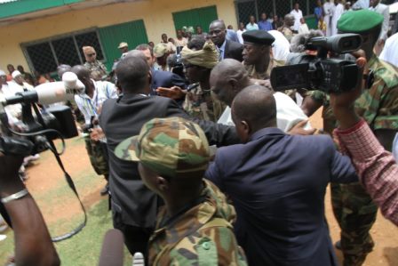 Quelque 72 heures après le coup de force, les blessés continuent d’affluer. La plupart ont été victimes de tirs. Mais l’hôpital ne dispose que de six médecins, assistés d’infirmiers, et manquent de presque tout. « Ce patient voudrait se faire nettoyer le visage avec un peu d’eau, mais j’ai dû lui répondre que nous n’avions pas encore d’eau à l’hôpital », explique Éric Gonda, l’un des infirmiers, soulignant l’état d’insalubrité général. Les chambres de l’établissement sont bondées de malades, nombreux sont ceux qui attendent une intervention depuis plusieurs jours.