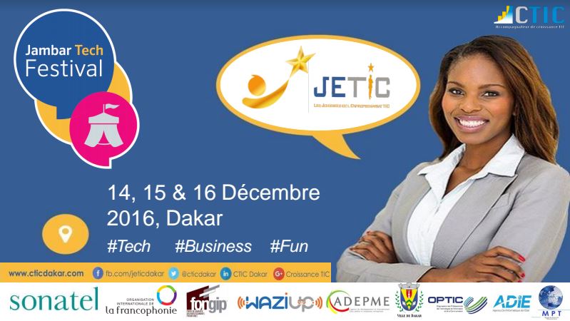 Du 14 au 16 décembre 2016, CTIC Dakar en collaboration avec le Ministère des Postes et des Télécommunications, SONATEL, le FONGIP, la Francophonie, le programme WAZIUP et des partenaires tels que la Mairie de Dakar, OPTIC et l’ADIE, organisera la 1ere édition du Jambar Tech Festival.