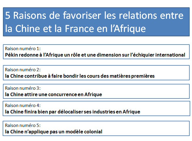La Chine devra délocaliser ses industries et aura besoin de coopération, avec les Africains mais aussi avec les expertises métiers, et la France reste experte dans de nombreux domaines : L’aéronautique, les mines, les technologies, les télécoms, les ports, le fret etc…