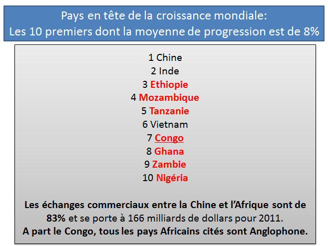 Notons que l’augmentation des échanges commerciaux entre la Chine et l’Afrique s’est accrue de 83% et se porte à 166 milliards de dollars pour 2011. Et que, à part le Congo, tous les pays Africains cités sont Anglophone.