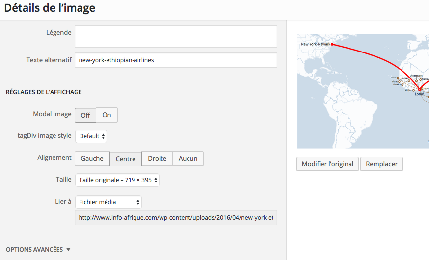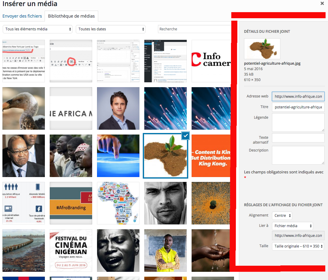 Quand dans vous sliquez une fois sur une photo dans « médias », sur la droite, en dessous de « DETAIL DU FICHIER ATTACHE », vous allez définir l’alignement de l’image (à gauche de votre texte, à droite ou centré), ainsi que sa taille.