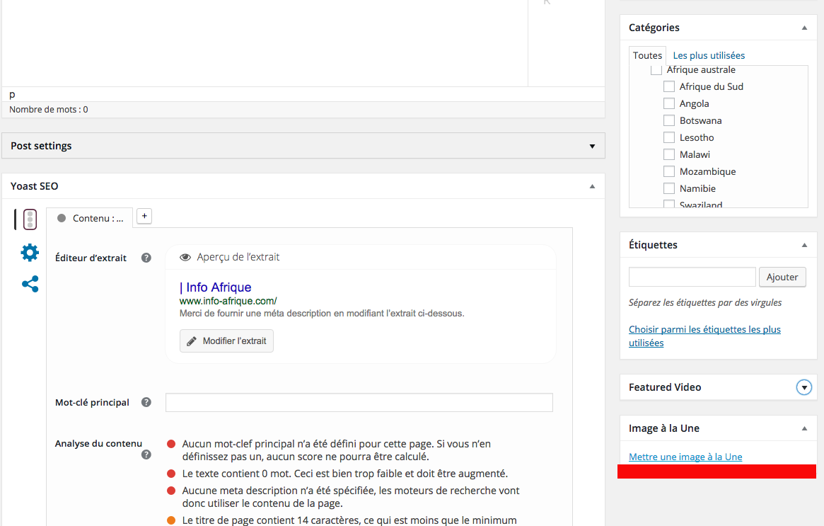 Saisissez ici le mot clé pour lequel vous aimeriez être référencé. Ce mot clé est utilisé pour vérifier si votre article est rédigé dans les règles de l’art. Une fois terminé, le voyant doit passer au vert, sinon orange et si cela ne va pas au rouge. Cette étape n’est pas obligatoire mais c’est un vrai bonus pour les articles.