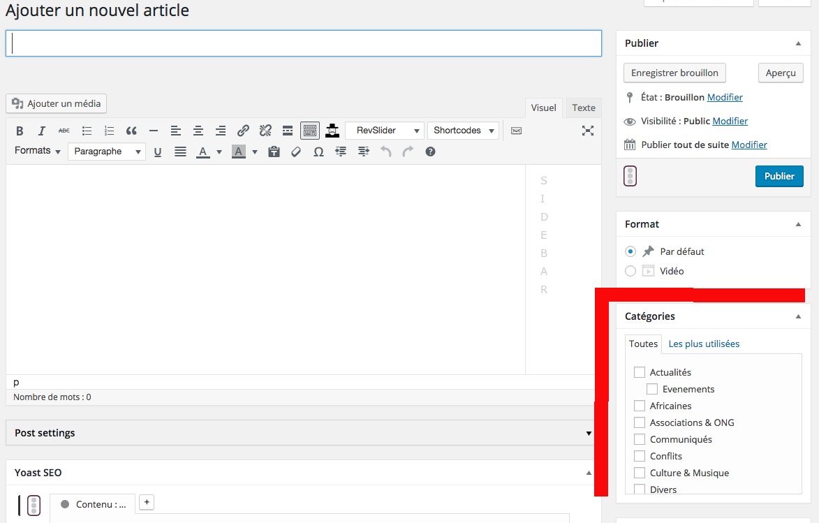 Il y a des catégories pour classer vos articles sur la page d’accueil et les lier à des menus, sélectionnez la catégorie à laquelle votre article doit appartenir. Cela se passe ici, à droite de votre tableau de bord.