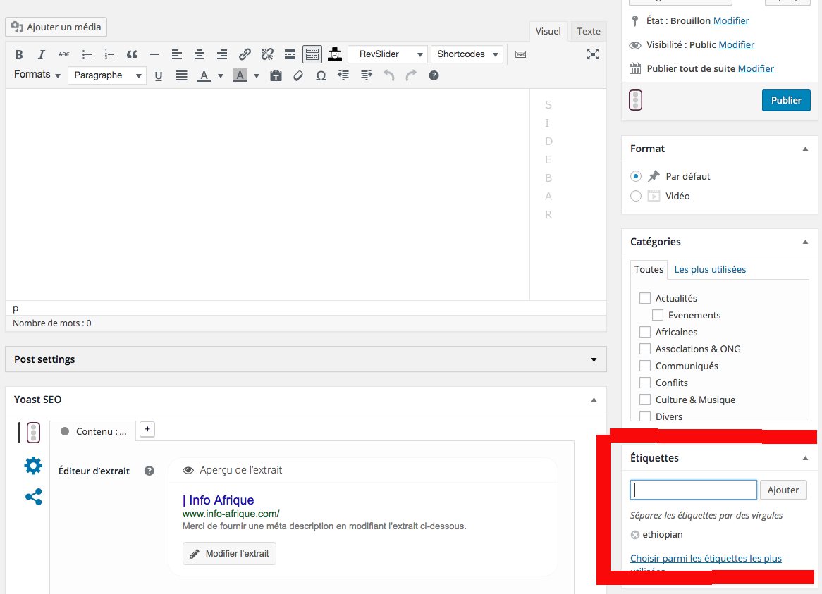 Sous les catégories vous avez un bloc « étiquettes », ajoutez un à un des mots clefs représentatifs de votre article, a chaque mot cliquez sur ajouter. Des mots sans majuscules, sans tiret, et pas de phrase, chaque insertion doit être un mot.