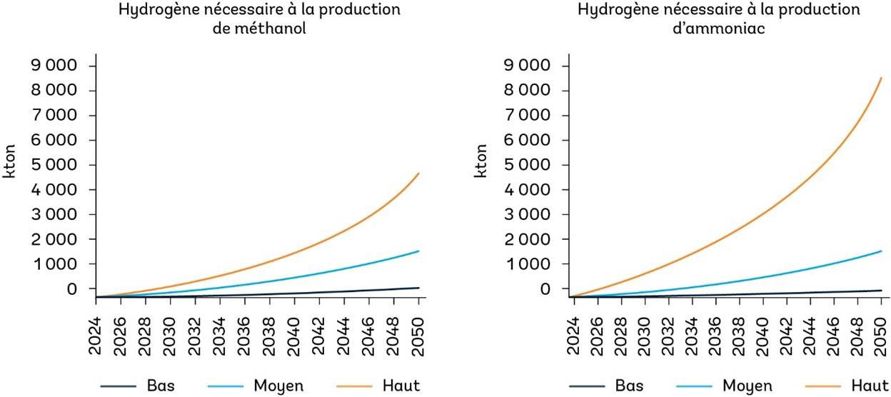 Le Groupe de la Banque mondiale estime que, d’ici 2030, dans un scénario de demande moyenne, les navires faisant escale dans les ports marocains pourraient nécessiter environ 0,2 million de tonnes d’hydrogène‑équivalent en carburant, et environ 2,83 millions de tonnes d’ici 2050. Cet hydrogène serait converti en combustible marine vert sous forme d’ammoniac ou de méthanol.
